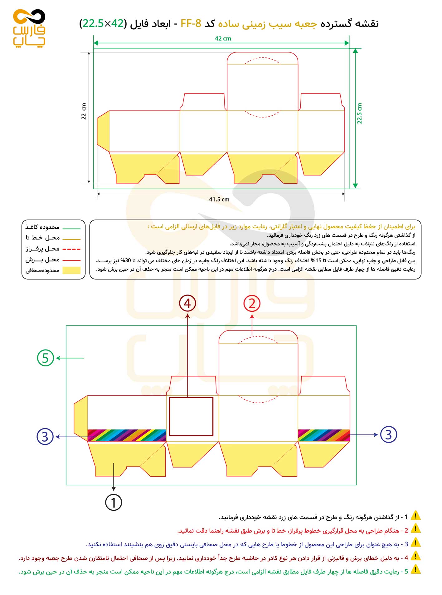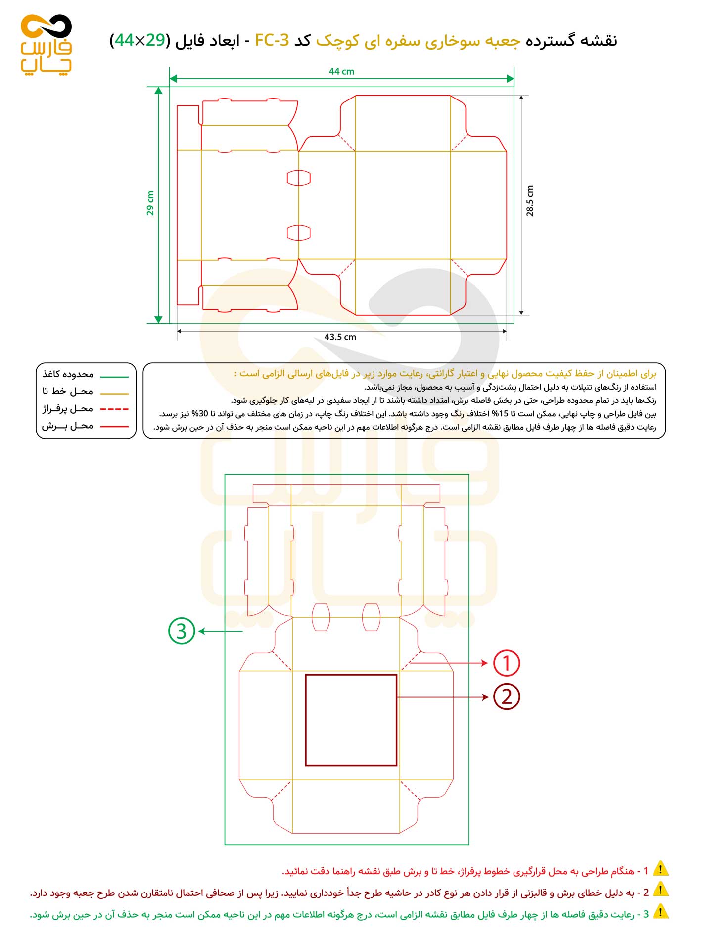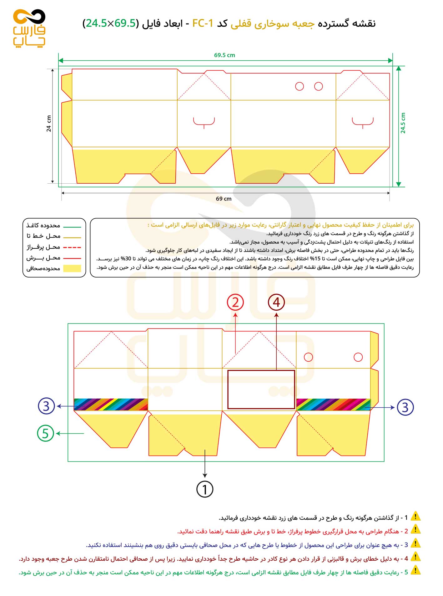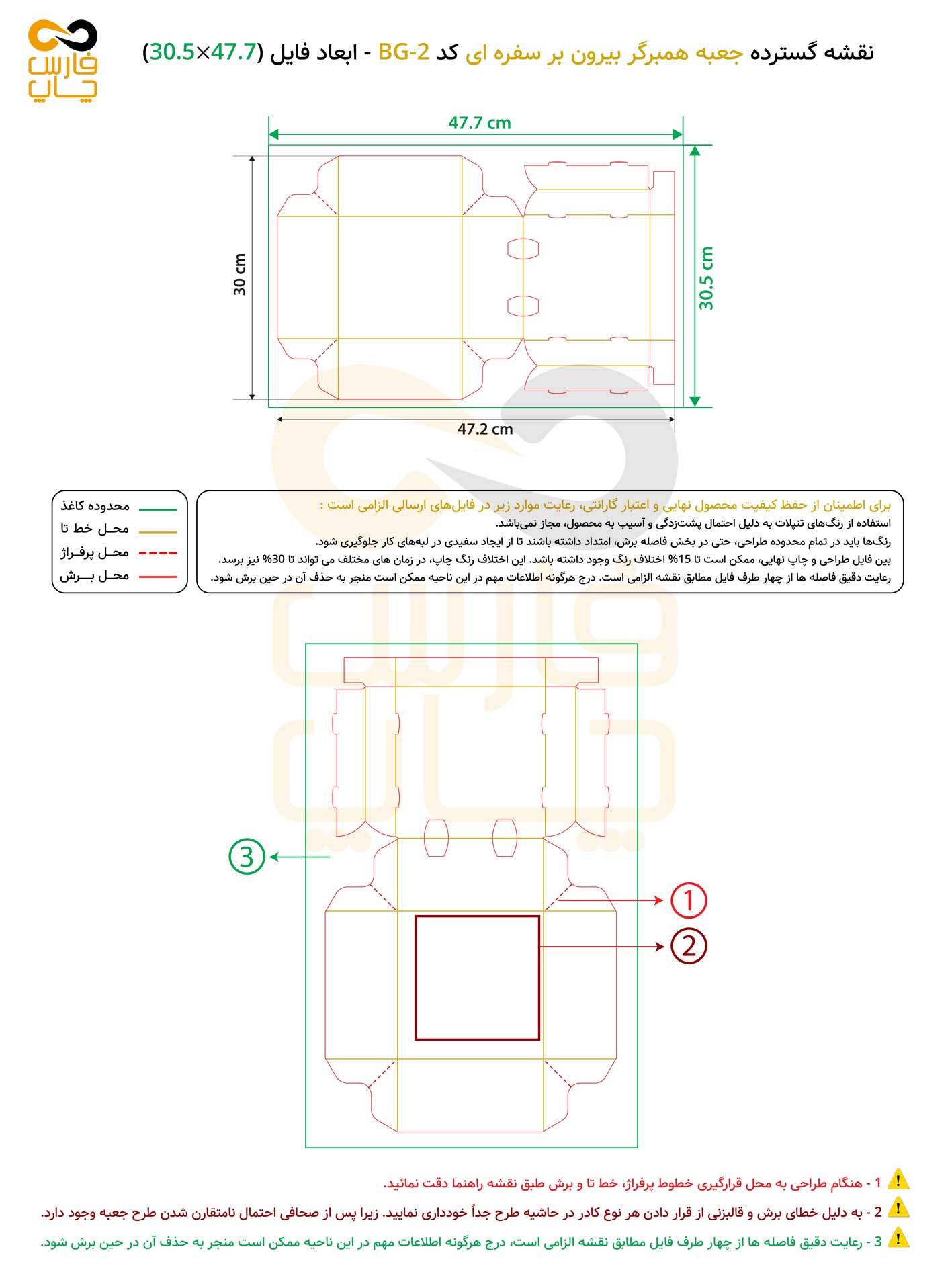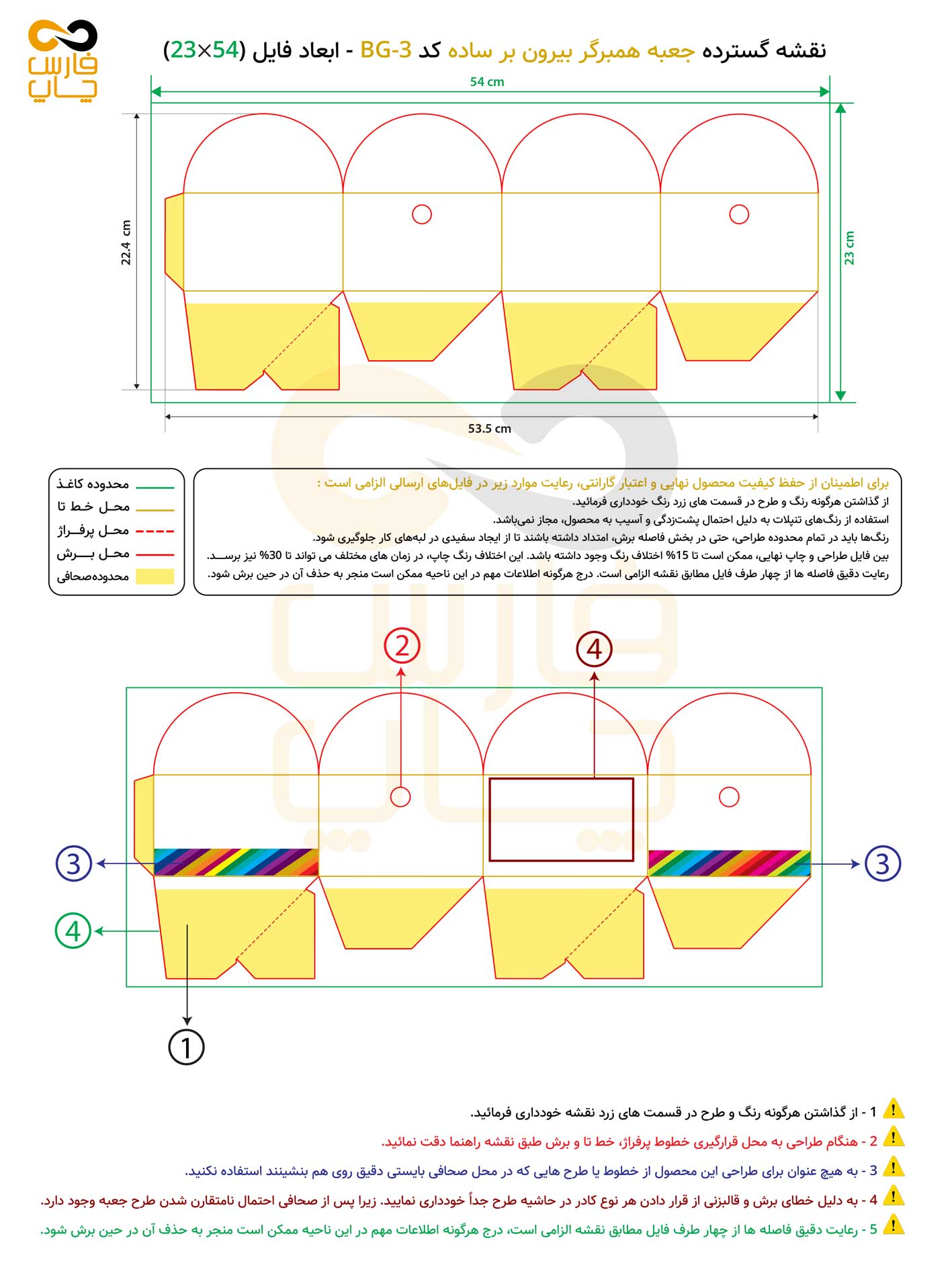 - برای زیبایی هرچه بیشتر محصول، در هنگام طراحی از قرار دادن متن و نوشته ها در فاصله کمتر از 2 سانتیمتری حاشیه های جعبه خودداری نمایید.