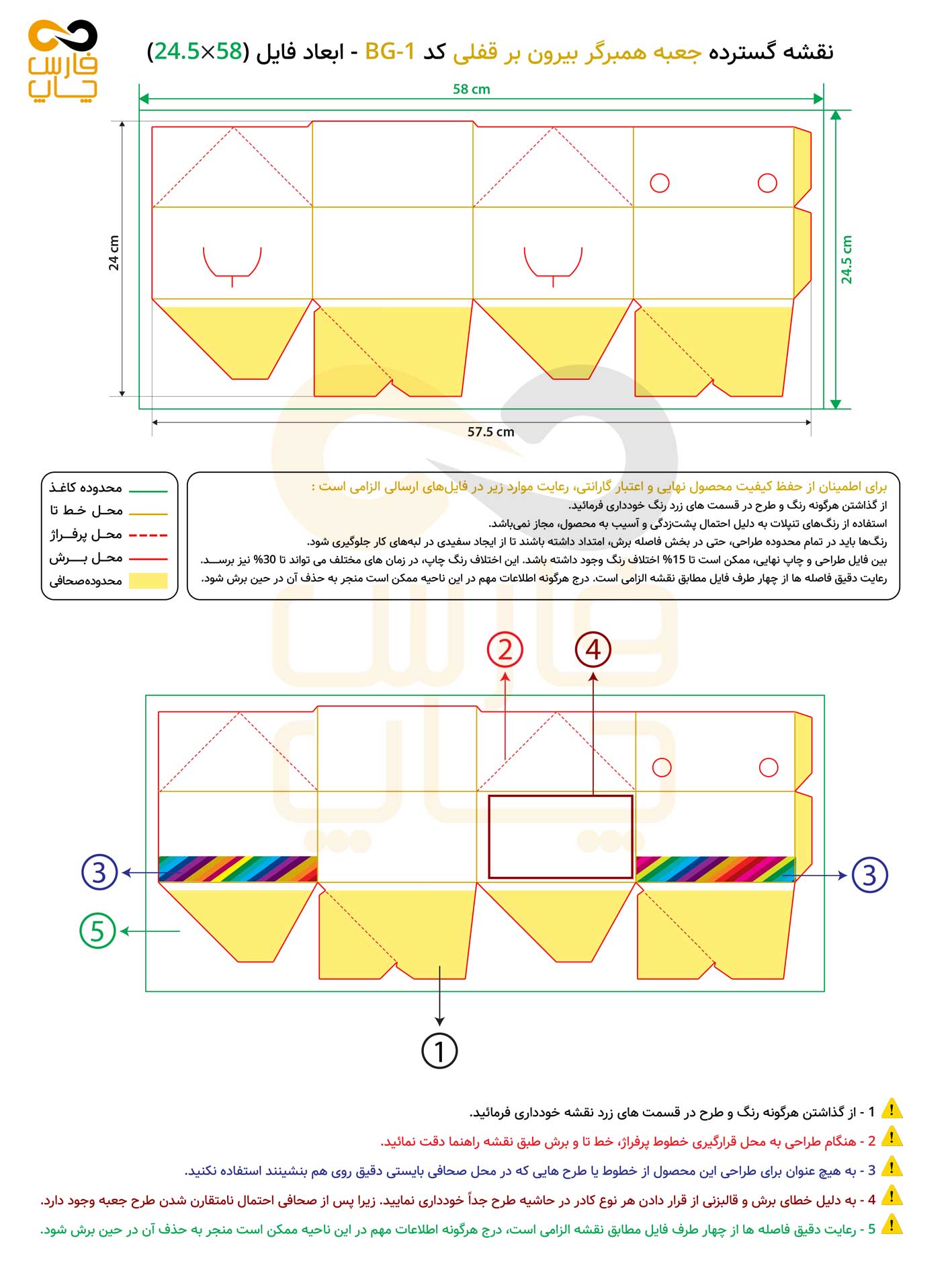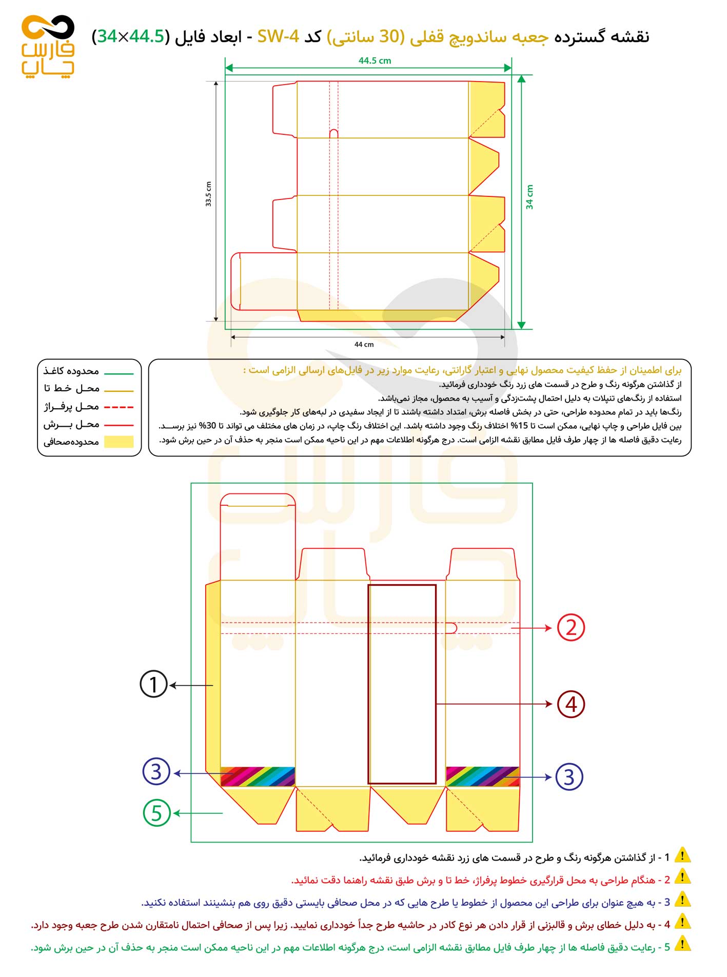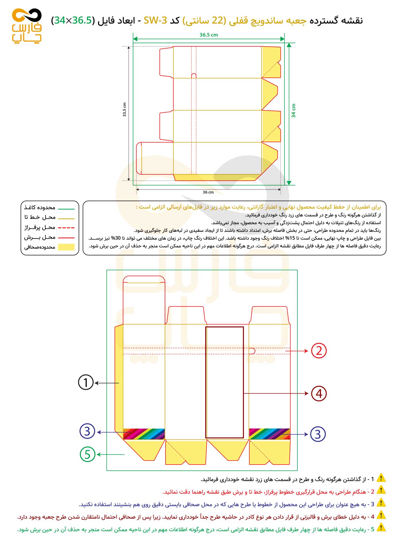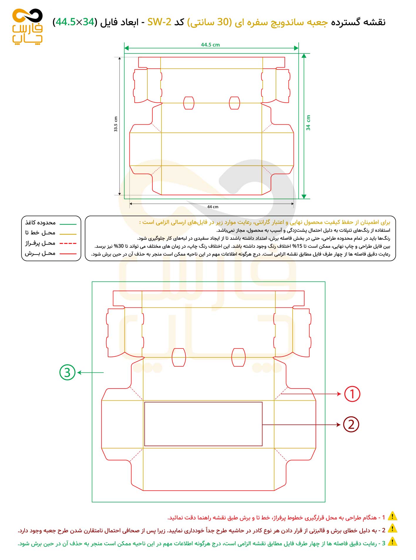 - برای زیبایی هرچه بیشتر محصول، در هنگام طراحی از قرار دادن متن و نوشته ها در فاصله کمتر از 2 سانتیمتری حاشیه های جعبه خودداری نمایید.